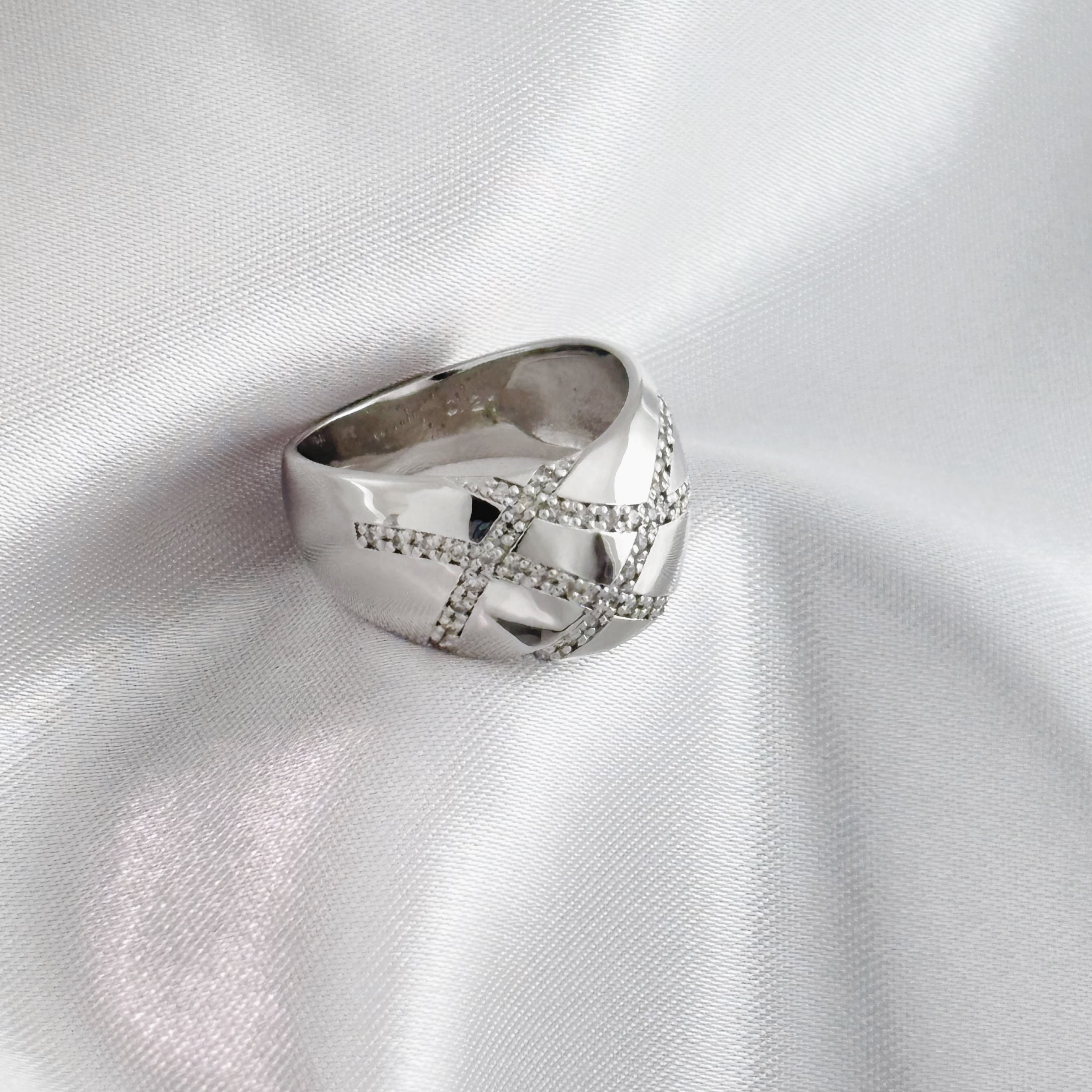 ボリュームのあるフォルムながら、ダイヤの滑らかな曲線と上質な輝きが上品に見せてくれるアイテムです。日常遣いや、コーディネイトのアクセントになる一品です。